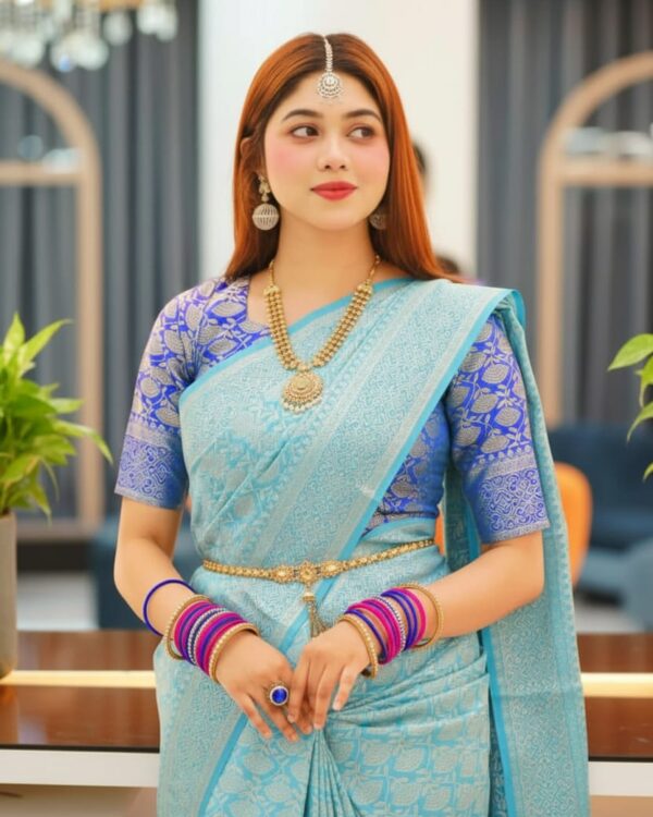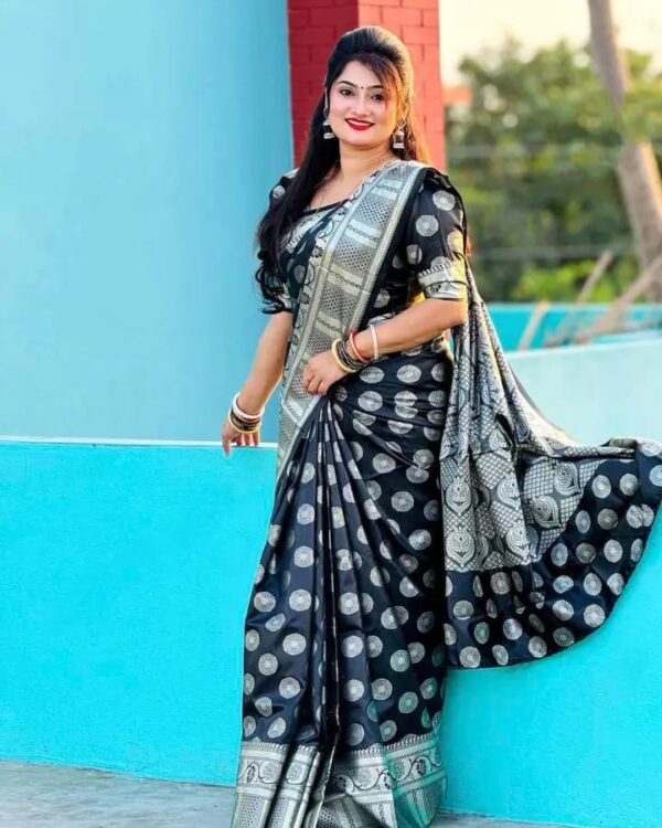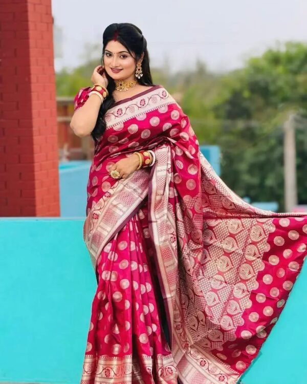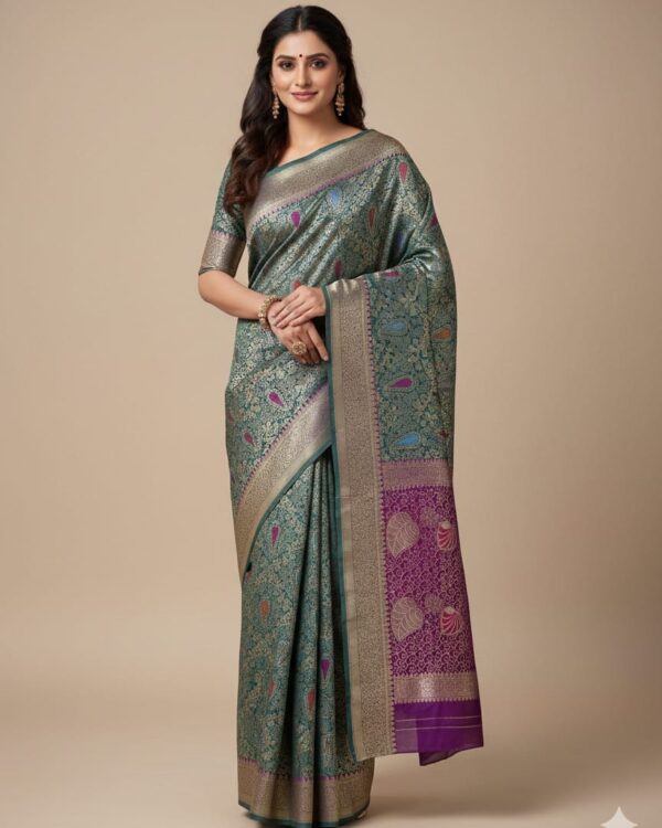 ফুল বডিতে গোল্ডেন সুতা এবং ঝলমলে জরি সুতার কাজ শাড়িটিকে করেছে এক্সক্লুসিভ ও এলিগ্যান্ট। নারীর সৌন্দর্য ফুটিয়ে তুলতে এই রুচিশীল, আধুনিক এবং ফ্যাশনেবল কাতান শাড়ি স্পেশাল কালেকশনের অংশ।